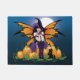 A bruxa-fada cabeleira, corajosa, toda em roxo, sentada entre uma mancha de abóbora durante uma lua de cheio com seu pequeno gato preto.