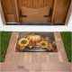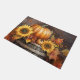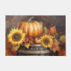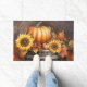 Uma bela porta de cores do outono ou do outono ou do tempo de colheita. Abóboras, girassóis e folhagem de outono num barril com borboletas. Verdadeiramente bonito!