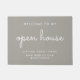 Uma propriedade moderna de casa aberta listando modelo de porta com uma fonte informal escrita manual em uma cinza de rato quente na moda. Adicione facilmente seu nome e detalhes de contato (telefone, email, mídia social e muito mais). O acessório perfeito para qualquer corretor ou agência de listagem de propriedades!