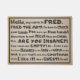 Esta design de porta minimalista foi projetada especialmente para você se você aprecia uma entrada moderna, na moda, com personalidade, sabedoria e humor. Combina a tipografia lúdica, atraente e amorosa em cores personalizáveis com o endereço direto e viscoso para os convidados de Fred Mat. O texto de "Fred the Mat" é dirigido diretamente aos seus visitantes e ao espectador da porta. Os textos e as expressões de Fred Mat são atrevidos, humorísticos, cheio de insinuações e, ao mesmo tempo, têm uma mensagem importante: "Tire seus calçados" ou "pelo menos limpe-os". A atenção dos seus convidados e os sorrisos estão garantidos. Divirta-se com Fred Mat. Para uma declaração encantadora à sua porta.