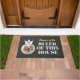 Novamente bem-vinda porta de um cão dono da família ou de um gato dono da família com uma foto do seu cachorro ou uma foto do seu gato embaixo de uma coroa branca com uma pata impressa. Cuidado com o governante desta casa é escrito ao lado dela em um simples design de tipografia.