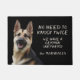 "Não é preciso bater duas vezes, temos um German shepherd" declara este tapete engraçado da porta. O texto está em bronzeado pálido do lado direito, enquanto um retrato de um belo GSD está à esquerda. Tudo é colocado sobre um fundo negro.