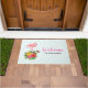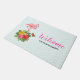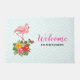 Mala de boas-vindas com uma ilustração digital fofinha com um flamingo rosa com uma perna erguida. Em pé sobre um buquê de flores e folhas de hibisco tropicais. Uma borboleta bonito está pairando ao redor das flores. Um padrão verde-claro e de fêmur branco no fundo.