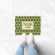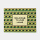 Os rinocerontes pretos e amarelos atravessam faixas verdes alternando com faixas vagamente "tecidas" em cores africanas de vermelho, preto e verde com sotaques amarelos neste tapete fácil de personalizar.