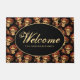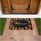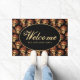 Este tapete gótico da porta de casa apresenta um padrão de crânios assustadores flutuando num abismo negro atrás do seu texto monográfico. Cada crânio é adorado com rosas vermelhas para o Halloween ou todos os dias. Os seus olhos vazios e sem alma são nitidamente contrastados contra a coroa gótico e buquês de flores mortos.
