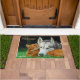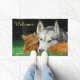 Gato somali e Husky siberiano se abraçam juntos, eles se amam, uma amizade próxima. Foto de um animal fofo tirada por Katho Menden. Este tapete de porta de fotografia "Bem-vindo" é uma ideia de presente para amantes de gatos e cães. Personalize-o com seu nome ou texto.