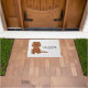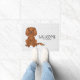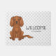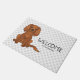 A ilustração original do desenho de Destei de um cão da raça Cavalier King Charles Spaniel, de cor rubi, que está sentado. Há também texto que agora lê "Bem-vindo" junto com uma área de texto personalizável para um nome de família ou outro texto personalizado. O fundo tem um padrão de estampas de cinza.