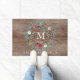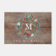 Linda cor d'água pinecone evergreen wreath doormat personalizado com seu nome inicial e familiar em um fundo de madeira rústica.