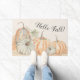 Bem-vindos à estação em estilo com este tapete de "Hello Fall" com abóboras de aquarela em um fundo de linen rústico. Os tons azuis, laranja, e muted suaves se misturam perfeitamente com o decor tradicional da varanda do outono, o boho ou a fazenda. Ideal para portas frontais, pátios ou entradas para adicionar um toque quente e convidativo no outono.