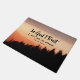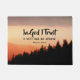 Uma porta de um formato de citação inspiracional mostra uma fotografia da natureza com pinheiros pretos da silhueta sob um lindo pôr do sol rosa e lavanda. Apresenta a Bíblia Verse Psalm 56:4b, "Em Deus eu confio, eu não terei medo." *