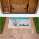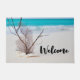 Uma porta de boas-vindas com uma linda fotografia. Água azul tropical e surf de espuma no fundo. Uma coleção de conchas e caules em uma praia branca de areia.