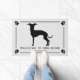 O design original da silhueta negra de Destei de um lindo cão da raça Greyhound em uma cor de fundo de cinza clara. O design é emoldurado por linhas de na moda duplo. Há uma silhueta de impressão de pata de cachorro em cada esquina também. Há duas áreas de texto personalizáveis também. As cores, incluindo a silhueta do cão, podem ser mudadas para qualquer outra cor, se assim o desejarem.