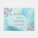 "welcome to our lake house" doormat with silver turtle son a blue silver alcohol ink background.