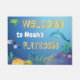Bem-vindos ao recreio infantil com criaturas marinhas debaixo do design do oceano. Edite o nome. A imagem colorida mostra uma cena submarina com tartaruga marinha, golfinho, polvo, vários peixes e corais. Excelente para pequenos amantes do oceano!
