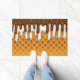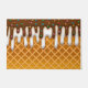 Chocolate e Sorvete de baunilha pingando em um cone de waffle com aspersores multicoloridos.
