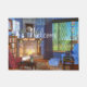 A cozy reading corner on a sunny spring day. Warm sunlight streams in through the lattice windows, leaving shadows on the wall and lighting up the cherry blossom "snowglobe" on the bookshelf. In the window is a colorful suncatcher sparkling in the light. Around the hearth are cushy armchairs, with vases of flowers and books and a steaming teacup, but the windows are open to let in the spring breeze. Outside a spring-green willow and beech hedge and red Japanese maple are surrounded by tulips and cornflowers, while a ginger cat stalks through the long grass.