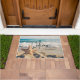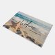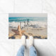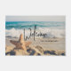 Bem-vinda à porta com uma foto cênica. Um grande peixe-estrela colocado em pé numa praia arenosa. Um belo mar azul com ondas de surf branco no fundo.