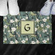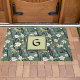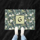This lovely doormat features a beautiful dusty teal Asian print of tropical flowers and golden green leaves in Chinoiserie style. Your initial appears in dark green against a chartreuse square, and is double bordered in dark green. This lovely Japanese style print adds a beautiful touch to your entryway and enhances your curb appeal. Make sure to type your initial in the Personalize section.