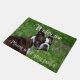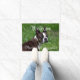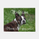 Terrier rajado e branco de Boston com "boa vinda - limpe por favor mensagem das suas patas". Sinta por favor livre adicionar, mudar, ou remover o texto se você gosta.