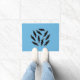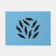 Este doormat noroeste do tema do Pacífico caracteriza um teste padrão circular dos ícones salmon. Feito no preto com guarnição branca, este teste padrão dos peixes pode representar salmões selvagens, pesca recreacional e comercial, Alaska, e outros assuntos. O fundo deste doormat é um azul de oceano, mas pode ser mudado a toda a cor.