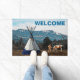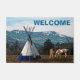 Uma cena da região noroeste do Pacífico dos Estados Unidos apresentando uma imagem de um nativo americano e seu cavalo perto de uma tipi. A neve assentou nas encostas dos mais alto das montanhas ao fundo. A leitura personalizável de texto, "WELCOME" também é exibida.