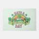 Uma porta com uma Rua. Imagem temática do Dia de Patrick. Um design de estilo retrô grunge que diz: Tenha um dia de sorte. Com um arco-íris colorido atrás. Palavras escritas em uma víbora retrora gorda arredondada. Cor rosa e verde.