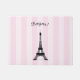 Estas características de design chiques, femininos uma imagem preta da torre Eiffel em um fundo listrado francês cor-de-rosa macio. Sua nome ou mensagem aparecem na rotulação francesa preta elegante (como mostrado aqui, diz "Bonjour"). Uma forma facil adicionar o estilo de Paris a sua porta!