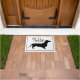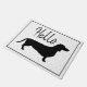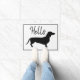 Porta preta e branca dachshund com padrão de micro pontos pretos e a palavra "Olá".