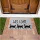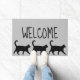 Três gatos pretos brancos atravessam sua porta. Acima dos gráficos do gato, a palavra WELCOME é impressa em fonte preto de tendência. O fundo da porta é cinza de luz. Um design divertido e sem carinho que dará as boas-vindas aos seus amigos e familiares para a sua casa. Se você preferir uma cor de fundo diferente ou uma mensagem diferente na porta, poderá usar as ferramentas na tela para mudar facilmente a mensagem e a cor para corresponder ao decoro. Se precisar de ajuda, entre em contato comigo. Vou ajudá-lo a criar seu design único!