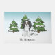 A ilustração original do desenho de Destei de um cão da raça Cavalier, de cor tricolor casaco. O cachorro é colocado numa cena de inverno. No local, está nevando ao fundo e há três pés verdes atrás do cão. As árvores têm neve neles. O fundo é um gradiente azul-claro a branco que dá a esta design aquele congelando do dia frio de inverno. Há também uma área de texto personalizável para um nome.