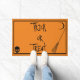 Um design de laranja e gótico preto minimalista com os símbolos assombrosos do Halloween, uma lua crescente, um crânio e uma vassoura de bruxa. Para aquele truque especial de Halloween ou tratar decoração ou Festa de Halloween. Entra no espírito assustador com o nosso tapete de Halloween ou tapete de porta do Treat! Este presente festivo é perfeito para festas de Halloween.