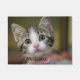 Uma porta com um gatinho tabby com olhos verdes, com um fundo embaçado Personalização a 100%. Clique no botão PERSONALIZAR para adicionar, mover, excluir, redimensionar ou alterar qualquer uma das fontes ou gráficos.