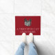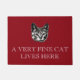 Um doormat para proprietários do gato. Uma ilustração preto e branco do vintage de um gato de gato malhado considerável com os olhos hipnóticos grandes olha fixamente para fora acima da legenda "que um gato muito fino vive aqui" na rotulação branca. A descrição é atribuída ao escritor inglês Samuel Johnson que fala sobre seu gato Hodge. O fundo é uma cor vermelha rica morna e dando boas-vindas mas você pode mudar este ao terno, também a pia batismal e a cor das citações do gato, com o botão da personalização.