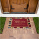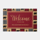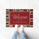 tapete de porta "bem-vinda" russo com uma manta de retalhos de controlo de búfalos vermelhos e pretos alternando com manchas de um design de prancha de madeira. Ursos e pinheiros são misturados no padrão. Personalize com "Bem-vindo" e seu nome de família, ou qualquer texto que você escolher. Perfeito para sua casa na montanha.