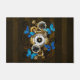 Composição do relógio de aço redondo com discagem numérica romana preta, decorado com engrenagens de ouro e latão, borboletas morfo azuis e lentes danificadas sobre fundo listrado castanho. Estilo Steampunk.