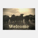 Este tapete de porta de boas-vindas em tons de sépia tem uma imagem de vacas negras e brancas em uma pastagem com um sol brilhante atrás delas.