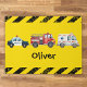 Este adorável tapete personalizado apresenta veículos bonitos de emergência a aquarela, carro policial, ambulância e caminhão de bombeiros.