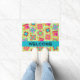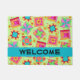 Mostre seu amor colcha e acolha convidados com este tapete de porta de arte colcha que é excelente para casa ou um negócio de colcha. A palavra personalizável "Bem-vindo" está em uma faixa azul-azul-turquesa e pode ser facilmente alterada para seu nome ou outra palavra. Esta arte original de colcha de retalhos combina blocos de colcha favoritos como cabana de madeira, estrelas e pinrodas, além de blocos únicos para formar um design de colcha com cores vibrantes e dinâmicas sobre um fundo de verde limão. As cores do bloco são verde, amarelo, rosa, laranja, vermelho e azul-turquesa. Pequenas flores amarelas estão no fundo entre os blocos. Isto faz um presente de excelente para um amante de colcha ou colcha. Totalmente personalizável para fazer isso seu. Esta arte original de colcha é da designer de tecidos e colchões Phyllis Dobbs.