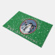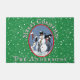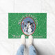 Uma vinheta oval vintage de uma cena de inverno onde os gatos caminham em volta de um boneco de neve decorado com meias decora este alegre tapete de boas-vindas. O Verde de Natal com pontos brancos nevados e sua saudação personalizada e seu nome familiar dão boas vindas a sua casa com alegria sazonal.