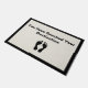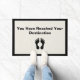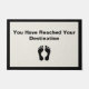 Uma porta humorística com "você chegou ao seu destino" e pegadas.