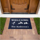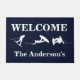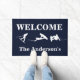 Um doormat para o entusiasta wakeboarding, este doormat caracteriza três silhuetas brancas dos wakeboarders. Personalize o texto com seu próprio nome de família, frase, ou o que quer que você deseja.