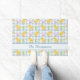 Destei's watercolor baby chick and pastel eggs on a blue gingham background arranged into a repeating Easter pattern. There is also a personalizable text area perfect for a family name or other custom text such as "Happy Easter!" or simply to say "Welcome".