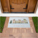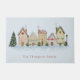 Destei's original hand-painted watercolor design featuring a row of five stone houses forming a Christmas village on a light blue background. Some houses are decorated with festive wreaths and bows, accompanied by old-fashioned street lamps, fir tree bushes and trees. Wisps of smoke curl from the chimneys and snow rests atop the scene. A light watercolor snow texture overlays the image, which can be removed if preferred. The design also includes a personalizable text area where you can add a family name, "Merry Christmas" text or any other custom message. This whimsical design brings a joyful and festive spirit to any holiday decor.