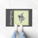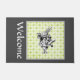 Ilustração vítrea de Alice no País das Maravilhas Coelho Branco na garba da Rainha do Coração em uma praça de safra amolecida, padronizada com cobertura branca de texto "bem-vindo"