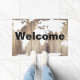 Silhueta do mapa branco do mundo sobre um fundo de plâncias de madeira russa e leve. As boas-vindas ao mundo estão em negros e letras grossas. Esta porta é excelente para a família bem viajada!