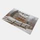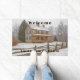 The perfect doormat for your country home or cabin. Photo of a beautiful log cabin, pine trees, fallen snow and rustic split rail fence.
