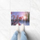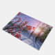 Morangos vermelhos brilhantes cobertos de gelo espumante contra o pano de fundo de um pôr do sol brilhante de inverno atrás de árvores negras e pinheiros escuros.