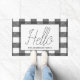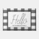 O búfalo rústico das cinzas e do branco verifica o doormat da xadrez com a palavra "olá!" no roteiro fino. Esta esteira pode ser personalizada com seu nome de família!