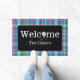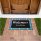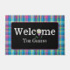Elevem sua entrada com nossa encantadora turquesa e xadrez roxa, palhaçada personalizada, com uma bola de golfe divertida em uma árvore de lavanda substituindo o O em Bem-vindo. Vestir sua entrada com um tapete de boas-vindas. O presente perfeito para o ávido golfista, ou clube do campo de golfe do 19º buraco.