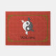 O Yin escuro e o Yang claro a natação koi ao redor um do outro criando um Taijitu Chinês clássico, representando harmonia e equilíbrio em todas as coisas. Uma fronteira chinesa clássica em ouro arma os dois peixes, e um padrão fraco de símbolos chineses para riqueza, longevidade, dupla felicidade e boa sorte em um fundo vermelho completa a design.